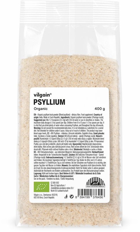 Psyllium je rozpustná vláknina, která je získána vyčištěním a následným rozemletím obalů semen jitrocele indického. Vilgain Psyllium má 98% čistotu, pochází z Indie a navíc je v BIO kvalitě.